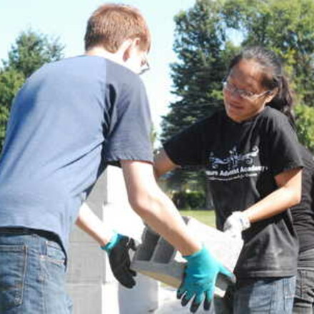 Volunteers hauled cement blocks and shoveled dirt in the bright September sun at the beginning of a 12-day block-laying mission in Auburn, Wash. The goal? To lay 14,000 blocks and build a permanent "Bethlehem" structure for the Auburn Academy Chur...