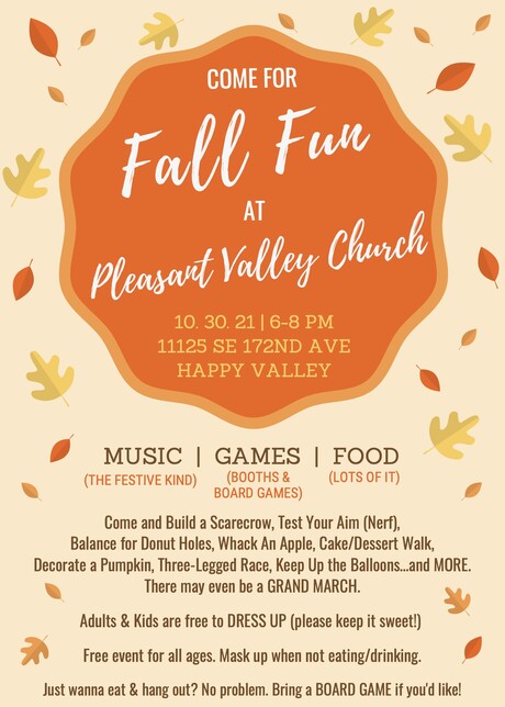 Fall Fun at PVC Fosters Community The halls rang with laughter and conversation at Pleasant Valley Church on Saturday evening, Oct. 30, 2021. The Fall Fun event, with games, crafts and food, had an attendance far beyond expectations. Initially planned for 100 people, the team serv... Read more